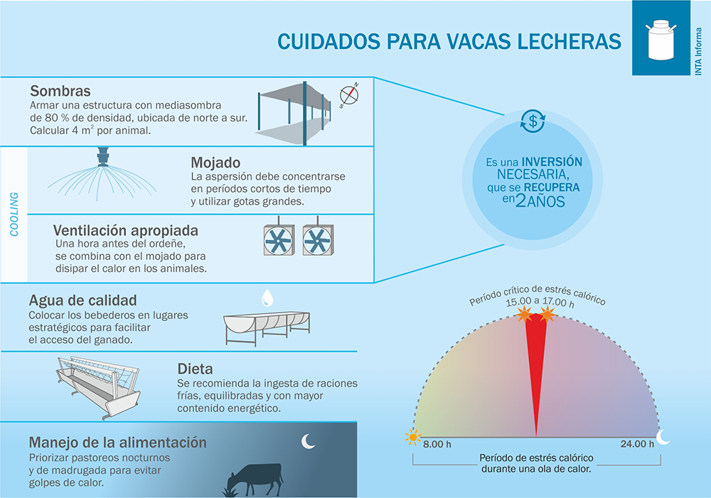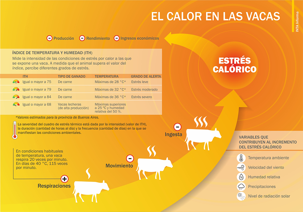 Estas infografías del INTA, publicadas en el portal oficial del Gobierno de la Nación Argentina, muestran las principales recomendaciones para reducir el estrés calórico en vacas lecheras y explican la importancia del Índice de Temperatura y Humedad (ITH) como indicador clave del bienestar animal. Con medidas simples como sombra, ventilación, mojado estratégico y una adecuada alimentación, se logra mitigar los efectos del calor en la producción y en la salud del rodeo.